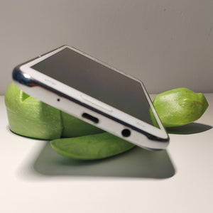 (*) Phones wider than 11mm will not fit in the holding gap. However, wider phones can be reclined on the top of the Baby Sea Turtle Holder as the neck has been designed to give support in this position.