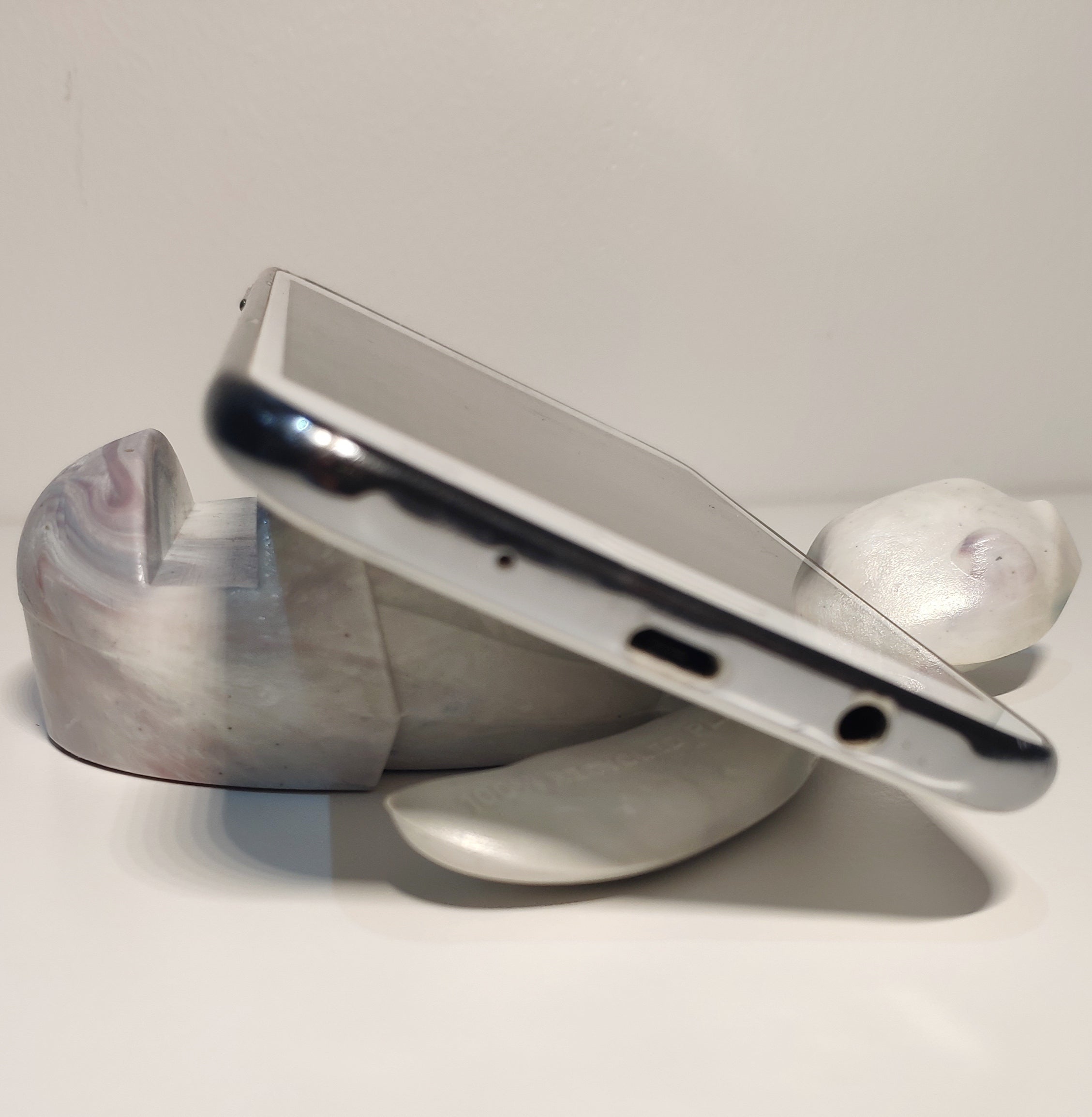 (*) Phones wider than 11mm will not fit in the holding gap. However, wider phones can be reclined on the top of the Baby Sea Turtle Holder as the neck has been designed to give support in this position.